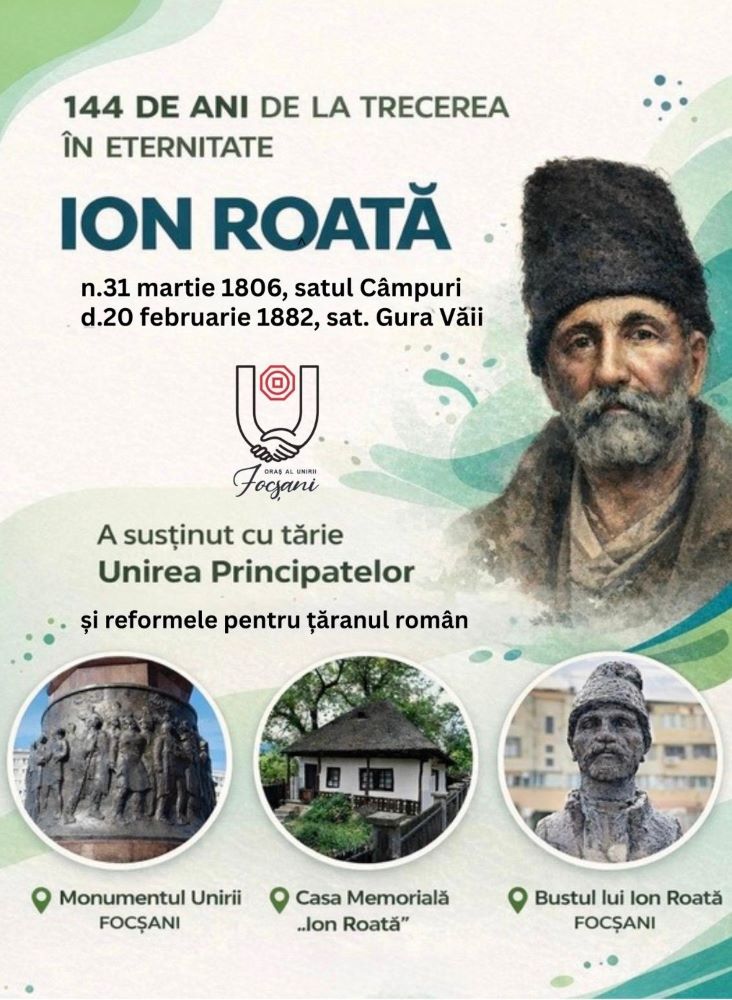 Astăzi îl comemorăm pe Ion Roată, țăranul vrâncean care a devenit un simbol al demnității, curajului și înțelepciunii populare în lupta pentru Unirea Principatelor. Născut la 31 martie 1806, în satul Câmpuri (fostul județ Putna), Ion Roată a fost țăran clăcaș și deputat în Divanul Ad-hoc al Moldovei. A susținut cu tărie Unirea Moldovei cu Țara Românească sub domnia lui Alexandru Ioan Cuza și reformele agrare care aveau să schimbe destinul țăranilor români. Pentru contribuția sa la înfăptuirea Principatelor Unite, la 18 martie 1878 a fost decorat cu Ordinul Național „Steaua României”, prin brevet semnat de Carol I, la inițiativa lui Mihail Kogălniceanu, ca recunoaștere a rolului său istoric. Figura sa a inspirat literatura română prin condeiul marelui povestitor Ion Creangă, care i-a dedicat povestirile „Moș Ion Roată și Unirea” (1870) și „Ion Roată și Vodă Cuza” (1882), surprinzând în ele istețimea și spiritul său drept.