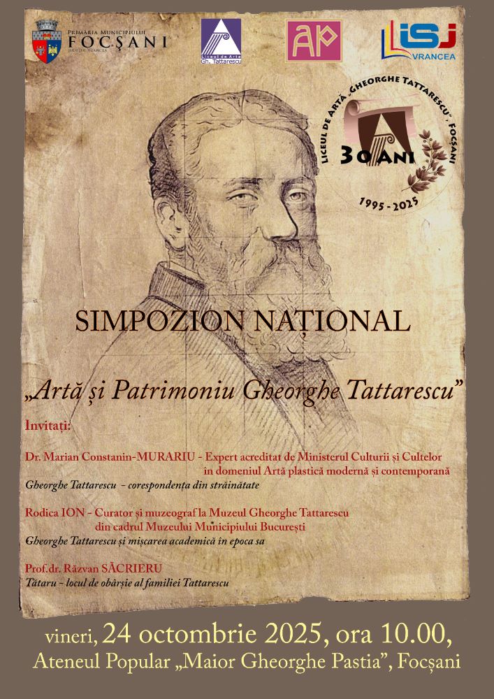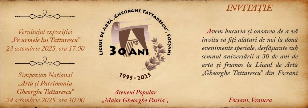 Trei decenii de culoare, sunet și emoție. Trei decenii în care visul artistic s-a transformat în tradiție. Trei decenii în care Liceul de Artă „Gheorghe Tattarescu” din Focșani a crescut generații de creatori, a modelat sensibilități și a înnobilat cultura vrânceană. În semn de recunoștință pentru acest parcurs, liceul organizează două evenimente de referință, desfășurate sub egida aniversării a 30 de ani de artă și frumos, dar și sub semnul comemorării marelui pictor Gheorghe Tattarescu (1818–1894), la 131 de ani de la trecerea sa în eternitate – „zugravul de subțire”, cum era numit în epocă, pentru finețea desenului și noblețea spiritului său.