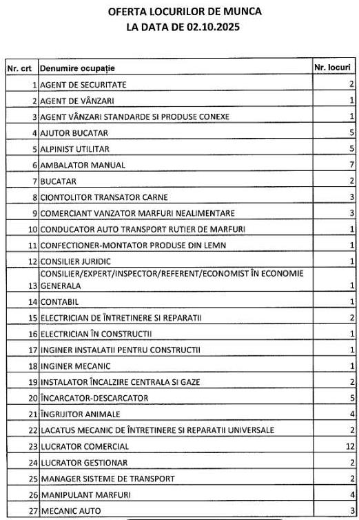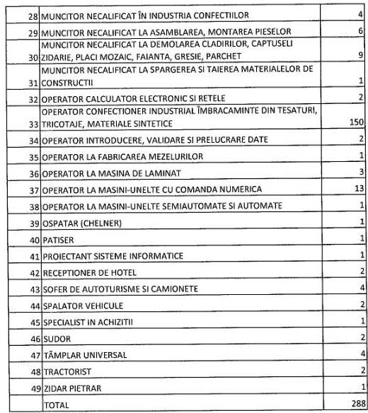 În evidențele Agenției Județene pentru Ocuparea Forței de Muncă Vrancea se află, la momentul actual, 288 locuri de muncă disponibile, transmise de agenți economici și instituții publice. Se caută ajutor bucătar-5; alpinist utilitar-5; ambalator manual-7; operator confecționer-150; îngrijitor animale-4; ingineri-2, lucrător comercial-12, manipulant mărfuri-4, lăcătuș mecanic-2, muncitor necalificat în industria confecțiilor-4, operator manual mașini unelte-13. Oferta integrală afișată de AJOFM Vrancea o găsiți în tabelul de mai jos.
