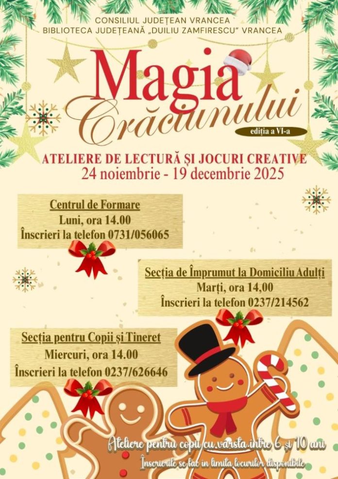 Consiliul Județean Vrancea, prin Biblioteca Județeană „Duiliu Zamfirescu” Vrancea, organizează, în perioada 24 noiembrie – 19 decembrie 2025, ediția a VI-a a atelierelor de lectură și jocuri creative, „Magia Crăciunului”. Aceste ateliere oferă posibilitatea copiilor de a-și dezvolta limbajul și imaginația prin lectură, dialog și joc de rol. Întâlnirile se vor desfășura la: