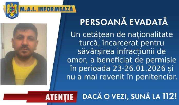 Astăzi, Poliția Capitalei a fost sesizată de către Penitenciarul Rahova despre faptul că un cetățean de naționalitatea turcă (Atas Abdullah), care era încarcerat pentru săvârșirea infracțiunii de omor (n.r. – sentință de 20 de ani și 6 luni pentru uciderea unui polițist rutier), a beneficiat de permisie în perioada 23-26 ianuarie 2026 și nu a mai revenit în penitenciar. Bărbatul în cauză a fost căutat la domiciliu (orașul Voluntari), fără a fi găsit. Au fost demarate verificări, pentru localizarea bărbatului.