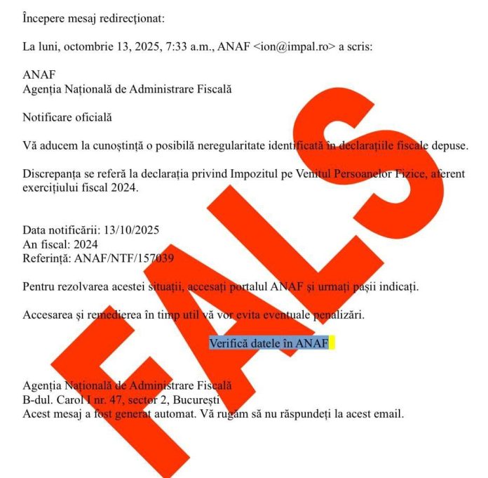 ANAF atenționează asupra unei noi campanii de emailuri false, transmise în numele instituției, de la adresa ion@impal.ro, prin care contribuabilii sunt anunțați de ”o posibilă neregularitate identificată în declarațiile fiscale depuse”, iar pentru ”remedierea situației” trebuie urmați anumiți pași.