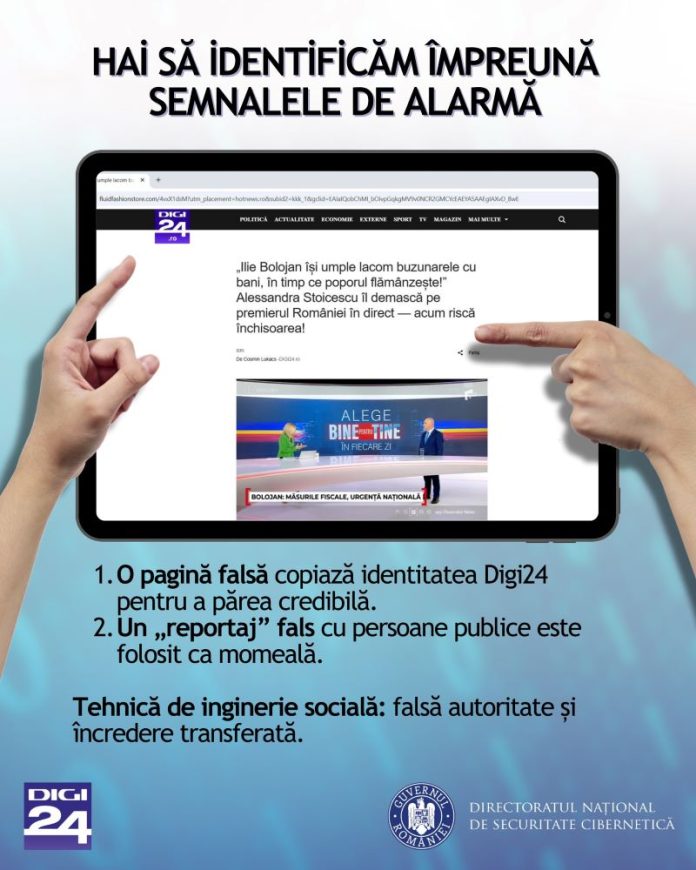 În prezent, circulă online un nou val de tentative de fraudă: pagini false care imită identitatea unor entități media cu notorietate, inclusiv Digi24 și alte branduri de presă, și promovează platforme fictive de investiții. Acestea sunt amplificate prin reclame online, care pot apărea în spațiile publicitare ale site-urilor cunoscute de știri, pentru a ajunge la un public cât mai larg. Tocmai o astfel de asociere le face mai credibile și, implicit, mai periculoase. Campania vizează în special vârstnicii sau persoanele interesate de suplimentarea veniturilor, categorii considerate de atacatori mai vulnerabile la promisiuni de câștig rapid și sigur.