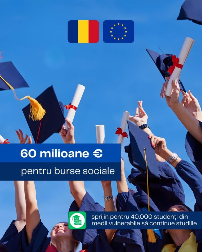 Comisia Europeană va aloca României suma de 60 de milioane de euro pentru burse sociale. Beneficiari vor fi studenții români, în număr de circa 40.000. Fondurile europene vor contribui, astfel, la prevenirea și combaterea abandonului universitar. Cele 60 de milioane de euro pentru anul universitar 2025–2026 provin din Fondul Social European Plus, prin Programul Educație și Ocupare. ”Ce înseamnă asta, în concret? Studenții din medii vulnerabile și grupuri dezavantajate își vor putea continua studiile. Niciun tânăr nu ar trebui să fie nevoit să renunțe la studii doar pentru că nu își mai permite financiar să rămână la facultate. Mulțumesc colegilor profesioniști din Ministerul Investițiilor și Proiectelor Europene care au făcut posibilă această alocare! Aceste burse nu înseamnă doar un sprijin lunar, ci mai important înseamnă generații de tineri care rămân să învețe, își finalizează studiile și devin profesioniștii de care România are nevoie.”, a transmis ministrul Investițiilor și Proiectelor Europene, Dragoș Pîslaru. „Această sumă va asigura plata burselor sociale pentru aproximativ 40.000 de studenți proveniți din medii vulnerabile în anul 2026. Estimarea este ca primele plăți să fie efectuate cel târziu în luna februarie a anului 2026. În acest mod, fondul de burse în noul an va fi nominal și în practică apropiat de anii 2024 și 2025 (după redimensionare) și cu aproximativ 35% mai mare decât în anul 2023, având acces la acesta atât studenții la buget, cât și studenții la taxă”, au precizat oficialii Ministerului Educației și Cercetării.
