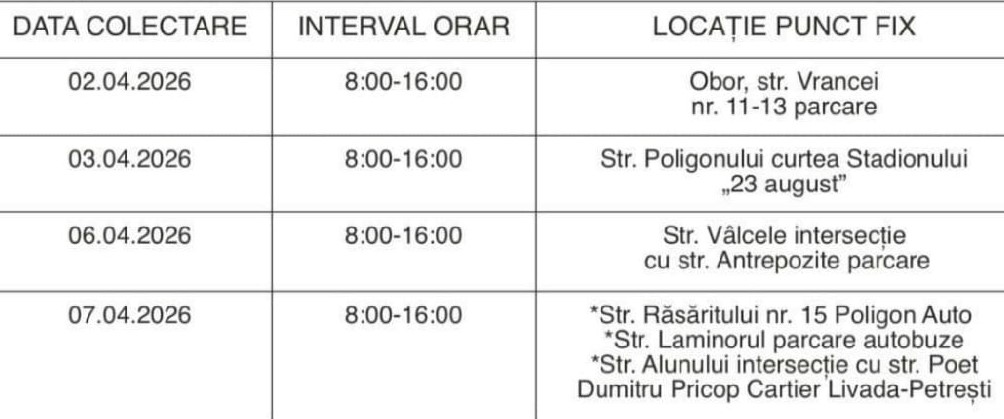 Deșeurile voluminoase vor fi ridicate direct de la domiciliu, în baza unei solicitări telefonice prealabile făcute între 23 – 27 martie 2026 orele 7:30 – 15:30, la dispeceratul operatorului Polaris, la numerele 0775 389 740 sau 0758 024 004. Colectarea deșeurilor textile, a DEEE-urilor și a deșeurilor periculoase se va realiza în puncte fixe amplasate în diferite zone ale municipiului Focșani, conform programului: