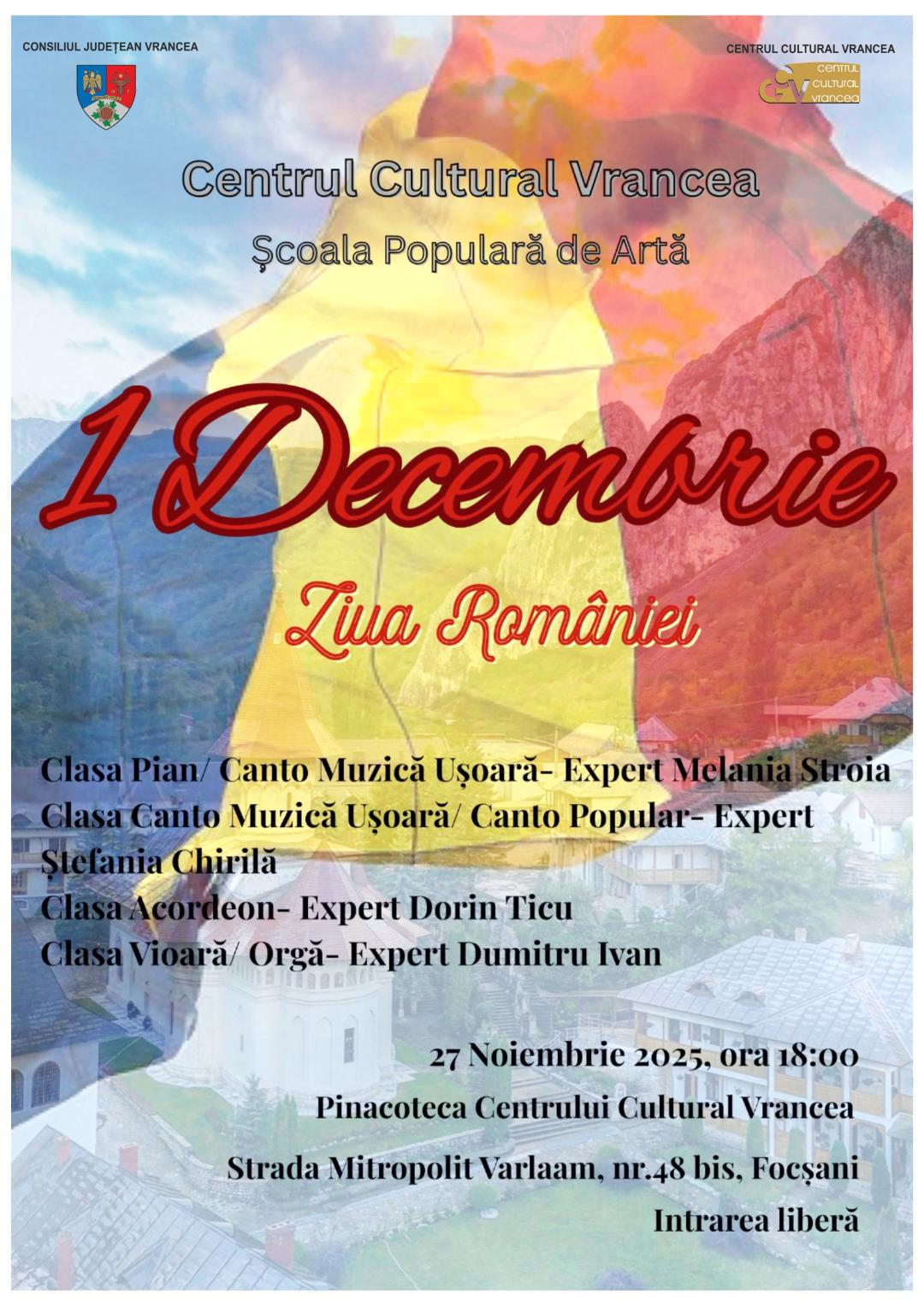 Consiliul Județean Vrancea, prin Centrul Cultural Vrancea, organizează joi, 27 noiembrie 2025, ora 18.00, la sediul instituției, un eveniment artistic dedicat Zilei Naționale a României – 1 Decembrie. Elevii claselor de muzică, de la disciplinele: Orgă, Vioară, Acordeon, Pian, Canto muzică populară și Canto muzică ușoară, vor susține un spectacol festiv dedicat tuturor vrâncenilor, afirmându-și cu mândrie identitatea națională, spiritul de patriotism și idealurile eroilor neamului. Cursanții claselor de muzică, din cadrul Școlii Populare de Artă, vor interpreta cu mândrie și emoție piese instrumentale și vocale ce reflectă spiritul românesc și marchează festivitatea zilei naționale: