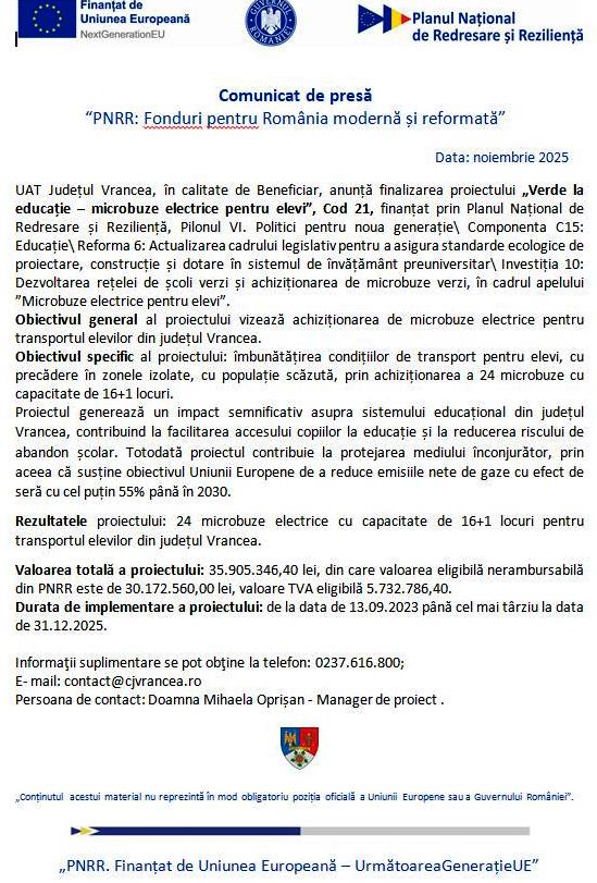 AcasăAdministratieComunicat de presă “PNRR: Fonduri pentru România modernă și... Administratie Comunicat de presă “PNRR: Fonduri pentru România modernă și reformată” By Redactia Vrancea24 10 noiembrie 2025 0 1717 Acțiune FacebookTwitterPinterestWhatsAppE-mailImprimare Acțiune FacebookTwitterPinterestWhatsAppE-mailImprimare Articolul precedentDe ce oferă cazinourile online noi bonusuri fără depunere românilor?Articolul următorULTIMA ORĂ Trafic blocat pe centura Focșaniului, în zona Carrefour / O mașină a lovit o țeavă de gaze Redactia Vrancea24 Știri din aceeași categorie Actualitate Intervenții pe drumurile județene în zonele unde a nins 24 decembrie 2025 Administratie Viorel Mîrza, președintele Asociației Comunelor Filiala Vrancea: Crăciun Fericit și La Mulți Ani! 24 decembrie 2025 Administratie VIDEO Nicușor Halici, președintele Consiliului Județean Vrancea: Crăciun Fericit și La Mulți Ani! 24 decembrie 2025 - Advertisment - Celee mai citite A murit scriitorul Radu F. Alexandru, fost senator al României 26 decembrie 2025 Femeie rănită într-un incendiu, la Mirceștii Noi 26 decembrie 2025 Meteo: vântul își face de cap în următoarele zile 26 decembrie 2025 Tragedie în noaptea Crăciunului: o femeie din Bogza, găsită carbonizată în propria locuință / 6 persoane evacuate în urma unui incendiu la Doaga 26 decembrie 2025 Încărcați mai multe