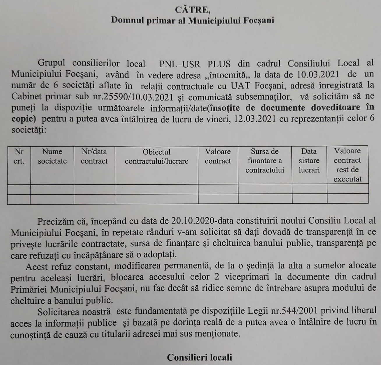 Consilierii PNL-USR îi solicită primarului Misăilă, oficial, informații detaliate despre lucrările desfășurate în municipiul Focșani