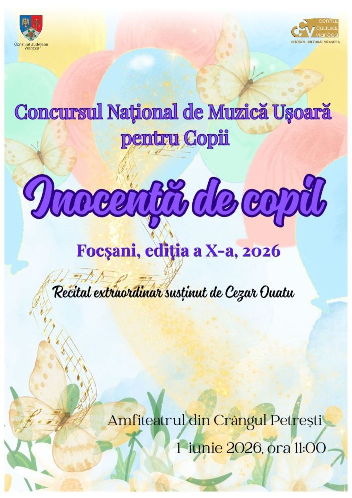 Consiliul Județean Vrancea, prin Centrul Cultural Vrancea, organizează luni, 1 iunie 2026, ora 11.00, în Amfiteatrul Crângului Petrești, Concursul Naţional de Muzică Uşoară pentru Copii Inocenţă de copil, ediția a X-a. Concursul, desfășurat cu ocazia Zilei Internaţionale a Copilului, are ca obiectiv valorificarea potenţialului creator al copiilor, descoperirea de noi talente interpretative, promovarea muzicii uşoare româneşti de calitate, afirmarea şi lansarea tinerelor voci. Datele de înscriere la concurs se pot descărca de pe site-ul instituției Centrul Cultural Vrancea: