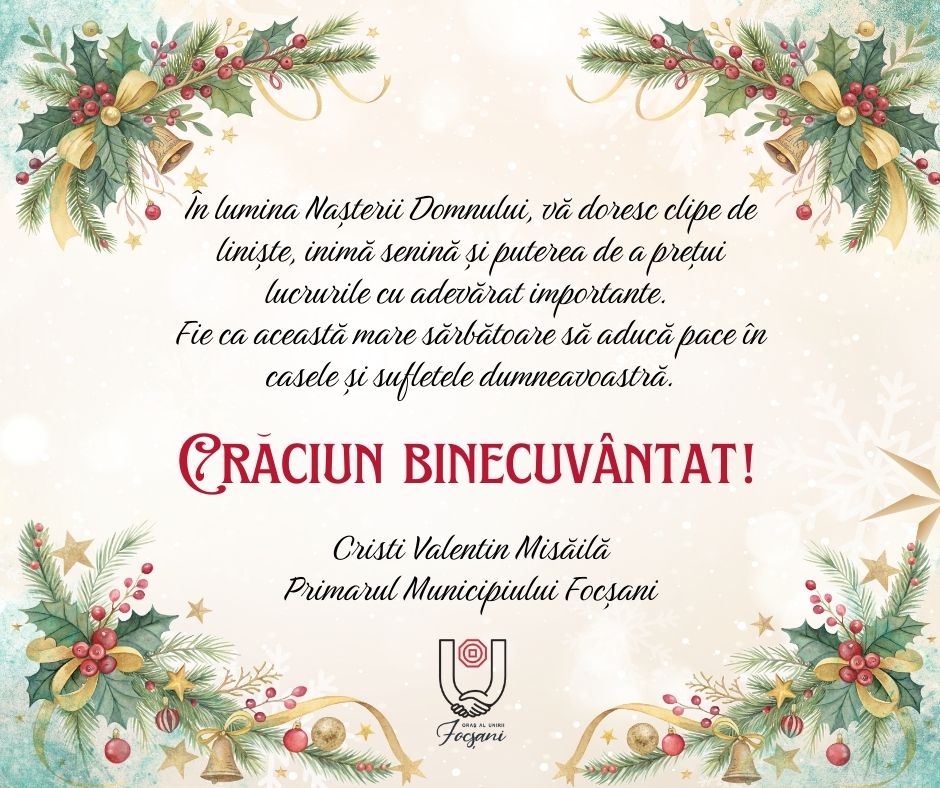 AcasăAnunturiCristi Misăilă, primarul municipiului Focșani: Crăciun Fericit! AnunturiFocsani Cristi Misăilă, primarul municipiului Focșani: Crăciun Fericit! By Redactia Vrancea24 24 decembrie 2025 0 133 Acțiune FacebookTwitterPinterestWhatsAppE-mailImprimare Acțiune FacebookTwitterPinterestWhatsAppE-mailImprimare Articolul precedentVIDEO Nicușor Halici, președintele Consiliului Județean Vrancea: Crăciun Fericit și La Mulți Ani!Articolul următorViorel Mîrza, președintele Asociației Comunelor Filiala Vrancea: Crăciun Fericit și La Mulți Ani! Redactia Vrancea24 Știri din aceeași categorie Anunturi Dragoș Ciobotaru, deputat PNL Vrancea: Crăciun Fericit! 24 decembrie 2025 Administratie Viorel Mîrza, președintele Asociației Comunelor Filiala Vrancea: Crăciun Fericit și La Mulți Ani! 24 decembrie 2025 Administratie VIDEO Nicușor Halici, președintele Consiliului Județean Vrancea: Crăciun Fericit și La Mulți Ani! 24 decembrie 2025 - Advertisment - Celee mai citite DGA-SJA Vrancea continuă seria faptelor bune 24 decembrie 2025 ISU Vrancea – acțiune umanitară în prag de sărbători 24 decembrie 2025 Polițiștii vrânceni, ajutoarele lui Moș Crăciun / Zâmbete, emoții și bucurie 24 decembrie 2025 Intervenții pe drumurile județene în zonele unde a nins 24 decembrie 2025 Încărcați mai multe