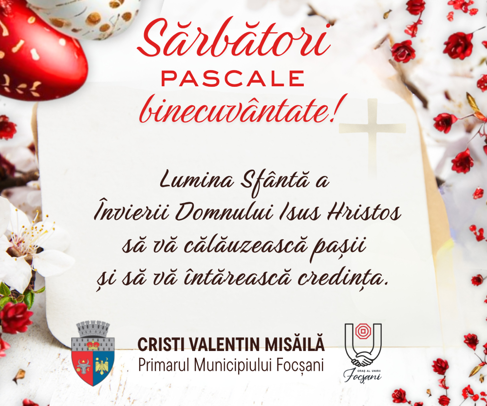 AcasăAnunturiCristi Misăilă, primarul municipiului Focșani: ”Sărbători Fericite!” AnunturiFocsani Cristi Misăilă, primarul municipiului Focșani: ”Sărbători Fericite!” By Redactia Vrancea24 11 aprilie 2026 0 124 Acțiune FacebookTwitterPinterestWhatsAppE-mailImprimare Acțiune FacebookTwitterPinterestWhatsAppE-mailImprimare Articolul precedentVIDEO Președintele Consiliului Județean Vrancea, Nicușor Halici: ”Sărbători Fericite!”Articolul următorOvidiu Burdușa, vicepreședinte PNL Italia: ”Sărbători Fericite!” Redactia Vrancea24 Știri din aceeași categorie Anunturi Dragoș Ciobotaru, deputat PNL Vrancea: ”Sărbători Fericite!” 11 aprilie 2026 Anunturi Viorel Mîrza, președinte Asociația Comunelor din România Filiala Vrancea: ”Sărbători Fericite!” 11 aprilie 2026 Anunturi Liviu Macovei, subprefectul județului Vrancea: ”Sărbători Fericite!” 11 aprilie 2026 - Advertisment - Celee mai citite Dragoș Ciobotaru, deputat PNL Vrancea: ”Sărbători Fericite!” 11 aprilie 2026 Viorel Mîrza, președinte Asociația Comunelor din România Filiala Vrancea: ”Sărbători Fericite!” 11 aprilie 2026 Liviu Macovei, subprefectul județului Vrancea: ”Sărbători Fericite!” 11 aprilie 2026 George Claudiu Nica, primarul municipiului Adjud: ”Sărbători Fericite!” 11 aprilie 2026 Încărcați mai multe