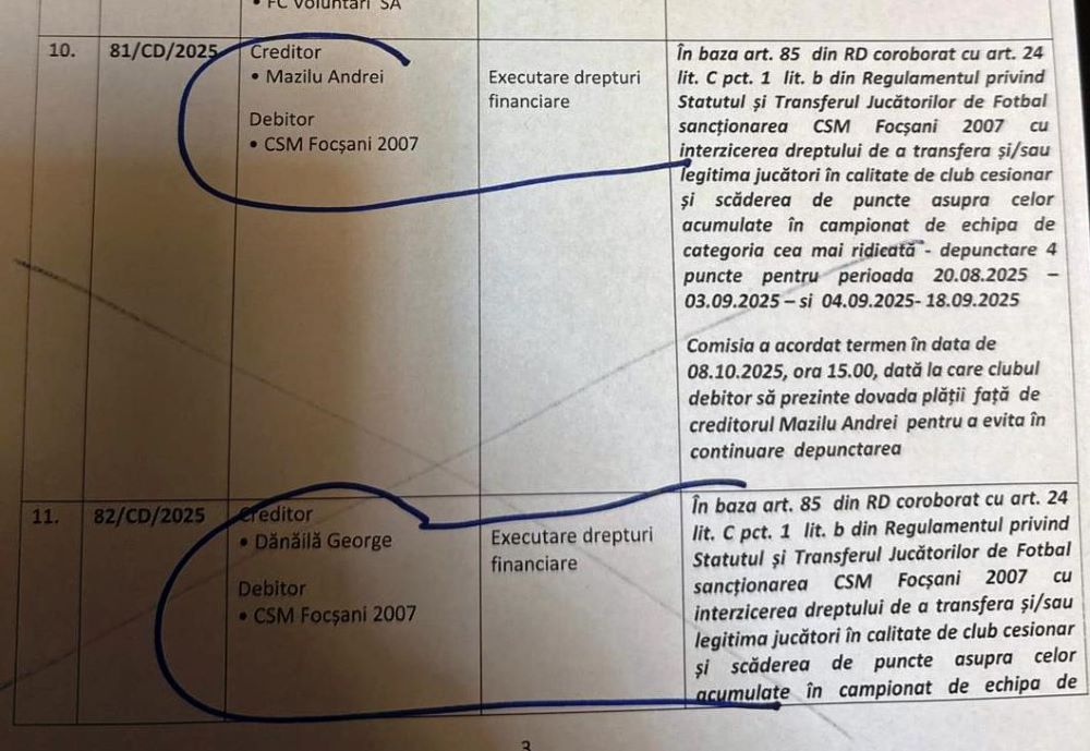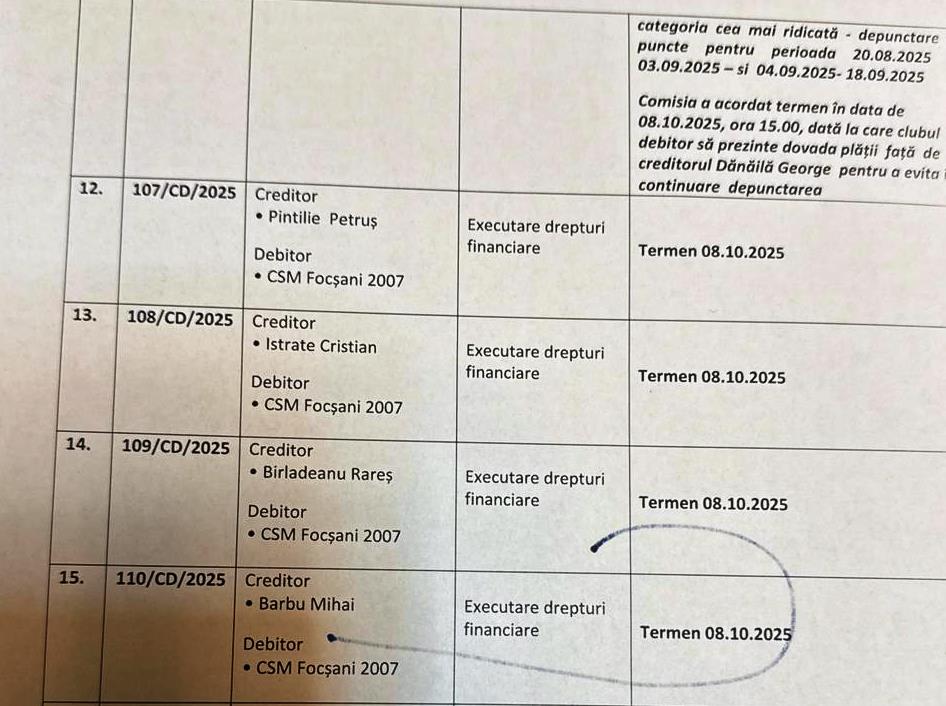 Situație din ce în ce mai grea la echipa de fotbal a municipalității focșănene. După retrogradarea în Liga 3 și înscrierea, cu greu, abia în Liga 4 (campionatul județean – Superliga Vrancei), CSM Focșani 2007 mai primește o lovitură. Federația Română de Fotbal a decis sancționarea echipei focșănene din cauza datoriilor către foști jucători: interzicerea dreptului de a mai transfera/ legitima jucători și depunctarea cu 4 puncte în actualul sezon. Deocamdată. ”În baza art. 85 din RD coroborat cu art. 24 lit. C pct. 1 lit. b din Regulamentul privind Statutul și Transferul Jucătorilor de Fotbal sancționarea CSM Focșani 2007 cu interzicerea dreptului de a transfera și/sau legitima jucători în calitate de club cesionar și scăderea de puncte asupra celor acumulate în campionat de echipa de categoria cea mai ridicată – depunctare 4 puncte pentru perioada 20.08.2025–03.09.2025 si 04.09.2025-18.09.2025. Comisia a acordat termen în data de 08.10.2025, ora 15.00, dată la care clubul debitor să prezinte dovada plății față de creditorul Mazilu Andrei pentru a evita în continuare depunctarea.”, se menționează în decizia Comisiei de Disciplină și Etică a Federației Române de Fotbal din data de 1 octombrie. Aceeași decizie s-a dat și în cazul jucătorului George Dănăilă. Mai mult, Comisia de Disciplină a FRF a dat termen pe 8 octombrie și pentru judecarea altor litigii ce vizează ”debitorul” CSM Focșani 2007: Petruș Pintilie, Cristian Istrate, Rareș Bîrlădeanu, Mihai Barbu, în calitate de ”creditori”, solicită plata drepturilor salariale restante. Și pe rolul Camerei Naționale de Soluționare a Litigiilor din cadrul FRF se află două dosare ale foștilor fotbaliști ai CSM Focșani 2007 – Sorin Săpunaru și Alexandru Crivac. Cele două litigii au termen pe 14 octombrie. De menționat că echipa focșăneană a avut și în trecut datorii către foști jucători, antrenori și conducători. Acum joacă în campionatul județean doar cu juniori, tot din cauza lipsei banilor. În cazul în care nu va achita datoriile, CSM Focșani 2007 riscă sancțiuni mai aspre, care pot ajunge până la dezafilierea de la Federația Română de Fotbal.