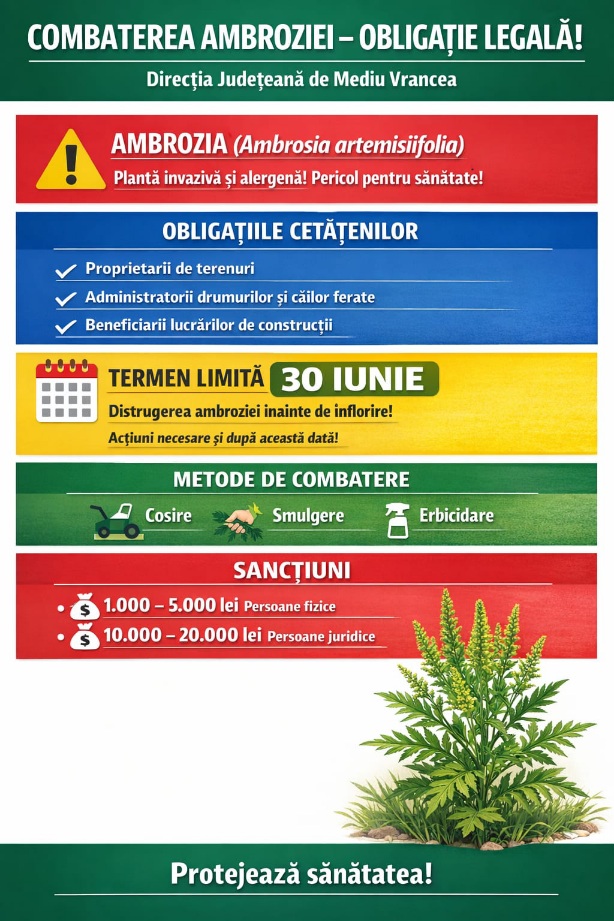 Direcția Județeană de Mediu Vrancea aduce la cunoștința publicului și a tuturor factorilor responsabili că, în conformitate cu prevederile Legii nr. 62/2018 (actualizată), combaterea ambroziei (Ambrosia artemisiifolia) reprezintă o obligație legală pentru proprietarii și administratorii de terenuri, precum și pentru beneficiarii de construcții. Ambrozia este o plantă invazivă cu un potențial alergenic ridicat, constituind un risc major pentru sănătatea populației, în special în perioada de polenizare. Au responsabilitatea de a preveni, combate și distruge ambrozia prin aplicarea de măsuri precum cosirea, smulgerea sau erbicidarea, în vederea eliminării plantei: