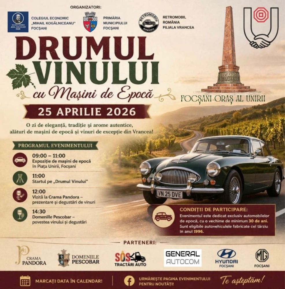Intră într-o lume unde eleganța mașinilor de epocă se împletește cu rafinamentul vinurilor românești, într-un eveniment special dedicat pasionaților de mașini clasice, tradiție și vinuri alese, o zi în care fiecare detaliu spune o poveste.