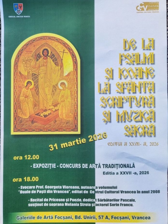 Consiliul Județean Vrancea, prin Centrul Cultural Vrancea, organizează și are onoarea de a invita publicul la cea de-a XXVII-a ediție a manifestării culturale și spirituale „De la Psalmi și Icoane la Sfânta Scriptură și Muzică Sacră”. Evenimentul va avea loc marți, 31 martie 2026, la Galeriile de Artă din Focșani (Bd. Unirii, nr. 57 A). Programul zilei este structurat în două momente principale, menite să celebreze tradițiile pascale, credința și valorile identitare românești: