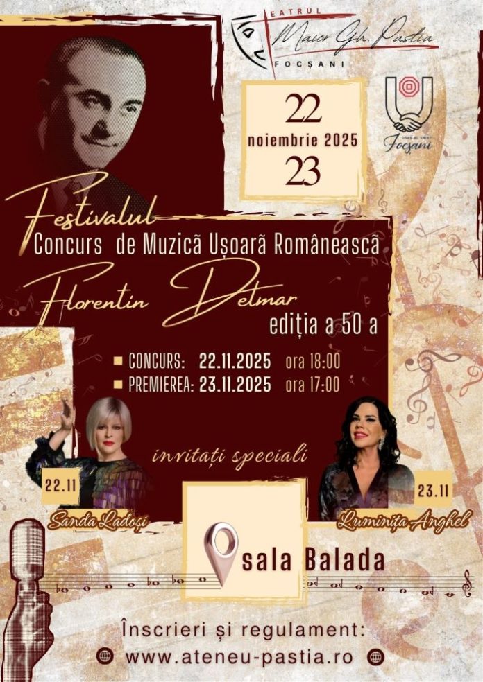 Festivalul Concurs de Muzică Ușoară Românească ”Florentin Delmar” împlinește frumoasa vârstă de 50 de ani în această toamnă. O jumătate de secol în care pe scena focșăneană au urcat cele mai cunoscute nume ale muzicii ușoare românești. Ediția din acest va avea loc pe parcursul a două zile, 22 și 23 noiembrie 2025, la sala Balada Focșani. Prima zi a Festivalului „Florentin Delmar”, sâmbătă, 22 noiembrie 2025, este dedicată interpretărilor tinerilor artiști iar duminică, 23 noiembrie 2025, va avea loc Gala Festivalului. În fiecare seară a Festivalului am pregătit recitaluri speciale cu două artiste minunate care au marcat istoria muzicii ușoare românești, Sanda Ladoși și Luminița Anghel.