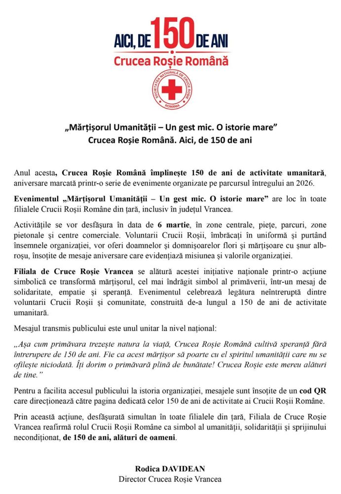 Crucea Roșie Română deschide calendarul activităților aniversare, la 150 de ani de la înființare, cu primul eveniment, organizat în data de 6 martie 2026: „Mărțișorul Umanității – Un gest mic. O istorie mare.” prin care își propune să celebreze legătura neîntreruptă dintre voluntari și comunitate, începută în urmă cu 150 de ani. Cruce Roșie Română promovează unitar și constant, la nivel național, lună de lună, rolul și valorile umanitare ale Mișcării de Cruce Roșie în comunitate.