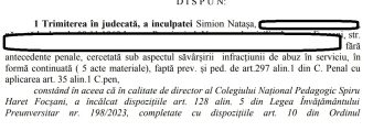 1 Trimiterea în judecată, a inculpatei Simion Natașa, fără antecedente penale, cercetată sub aspectul săvârșirii infracţiunii de abuz în serviciu, în formă continuată (5 acte materiale), faptă prev. și ped. de art.297 alin.1 din C. Penal cu aplicarea art. 35 alin.1 C.pen, constând în aceea că în calitate de director al Colegiului Național Pedagogic Spiru