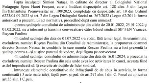 – în cadrul ședinței din data de 01.07.2022 s-a votat, fără temei legal, în unanimitate, excluderea numitei Roșcan Paulina din Consiliul de Administrație, la propunerea doamnei director Simion Natașa, în condițiile în care numita Roșcan Paulina nu a fost prezentă la ședință pentru a–și susține punctul de vedere, nefiind convocată.