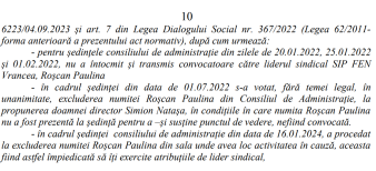 – în cadrul ședinței consiliului de administrație din data de 16.01.2024, a procedat la excluderea numitei Roșcan Paulina din sala unde avea loc activitatea în cauză, aceasta fiind astfel împiedicată să îți exercite atribuțiile de lider sindical,
