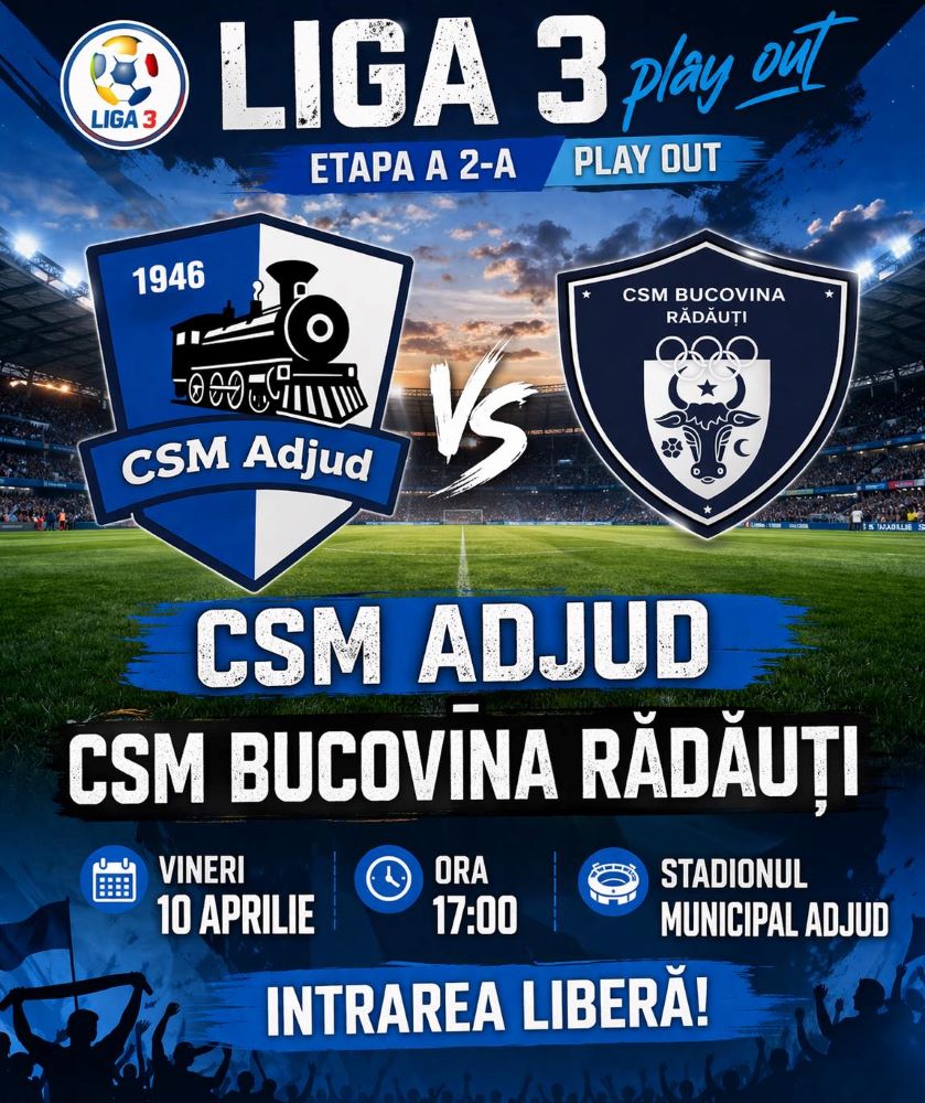 CSM Adjud 1946 speră până în ultimul minut de joc să se salveze de la retrogradare. Astăzi, pe stadionul Municipal, echipa adjudeană va întâlni CSM Bucovina Rădăuți, în etapa a doua a fazei play-out a Ligii 3 de fotbal. După cum știți, adjudenii au un antrenor nou – Cristian Popovici – cu experiență în primele eșaloane fotbalistice, astfel că speranțele fotbaliștilor, oficialilor clubului și ale suporterilor sunt îndreptățite. Înainte de partida de astăzi, CSM Adjud 1946 se află pe locul 7 (din 8) în seria I play-out, cu 22 de puncte, în timp ce Bucovina Rădăuți este pe locul 4, cu 29 de puncte. ”După evoluțiile din ultima perioadă, băieții noștri își propun să continue seria rezultatelor pozitive și să obțină puncte importante în economia clasamentului dar și în vederea îndeplinirii obiectivului de a se menține în viitorul sezon în în campionatul național liga a III-a. Partida se anunță una disputată, în care sprijinul suporterilor poate face diferența. Conducerea clubului invită toți iubitorii fotbalului din Adjud și împrejurimi să fie alături de echipă și să creeze o atmosferă frumoasă în tribune.”, au transmis reprezentanții clubului adjudean.