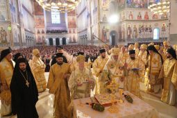 După Sfânta Liturghie, a urmat slujba de sfințire a picturii, săvârșită de cei doi întâistătători, în fruntea unui sobor impresionant de 64 de ierarhi. Evenimentul s-a desfășurat în prezența numeroaselor oficialități de stat din România și Republica Moldova, a reprezentanților altor culte religioase, a membrilor Academiei Române, precum și a mii de pelerini din țară și din diaspora, printre care s-au numărat sute de clerici și credincioși buzoieni și vrânceni. Momentul liturgic a fost unul de o deosebită frumusețe duhovnicească: pereții exteriori ai Catedralei, icoanele în mozaic, catapeteasma și pictura din interior au fost sfințite prin stropirea cu Aghiasmă și ungerea cu Sfântul și Marele Mir, potrivit rânduielii bisericești. De asemenea, au fost binecuvântate raclele confecționate în Atelierele Patriarhiei Române pentru a adăposti cinstitele moaște ale Sfântului Cuvios Dionisie Vatopedinul de la Colciu și ale Sfântului Cuvios Petroniu de la Prodromu, oferite de Preafericitul Părinte Patriarh Daniel celor două așezăminte athonite: Chilia „Sfântul Gheorghe”-Colciu și Schitul Românesc Prodromu. Prin participarea Înaltpreasfințitului Părinte Ciprian și a delegației eparhiale la acest eveniment solemn, Arhiepiscopia Buzăului și Vrancei s-a unit în rugăciune și recunoștință cu întreaga Biserică Ortodoxă Română, aducând slavă lui Dumnezeu pentru binecuvântarea lucrărilor de împodobire cu pictură a Catedralei Naționale – simbol al credinței, unității și demnității poporului român. (Arhiepiscopia Buzăului și Vrancei)