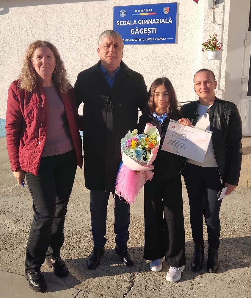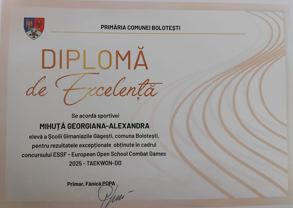 Georgiana Alexandra Mihuță este elevă la Școala Gimnazială Găgești, comuna Bolotești, și practicantă de arte marțiale – Taekwon-Do, la Clubul Sportiv Addras din Focșani. Talentul, efortul și perseverența au dus la rezultate foarte bune: până acum, la vârsta de 13 ani, Georgiana Mihuță a obținut numeroase titluri și medalii naționale și internaționale. Ultima mare performanță: locul I la European Open School Combat Games-disciplina Taekwon-DO ITF, un eveniment sportiv de anvergură, desfășurat în luna iulie a.c., la care au participat sportivi din peste 20 de țări. Datorită acestor performanțe, Primăria Comunei Bolotești a premiat-o pe tânăra sportivă în cadrul unei ceremonii desfășurate în curtea școlii, alături de elevi și cadre didactice.