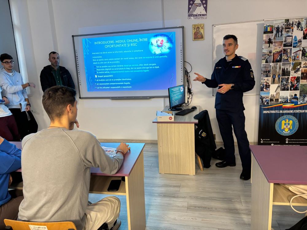 Astăzi, jandarmii vrânceni au fost prezenți la Liceul de Artă „Gheorghe Tattarescu” din Focșani, unde au desfășurat o activitate cu caracter preventiv – educativ, la care au participat aproximativ 150 de elevi și cadre didactice. Întâlnirea a avut drept scop informarea tinerilor cu privire la situațiile de risc la care pot fi expuși, precum și formarea unui comportament responsabil atât în mediul școlar, cât și în afara acestuia. Discuțiile au abordat teme de actualitate și interes pentru elevi, precum: