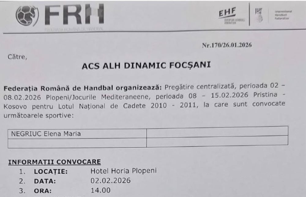 Prestațiile foarte bune ale echipelor de handbal feminin ale clubului ALH Dinamic Focșani, în toamna trecută, au atras atenția tehnicienilor care se ocupă de loturile naționale. Astfel, tânăra handbalistă Elena Maria Negriuc a fost convocată la lotul național de cadete. Acest lot se va pregăti, centralizat, la Plopeni (2-8 februarie), în vederea participării la Jocurile Mediteraneene. Competiția va avea loc în perioada 8-15 februarie la Pristina, în Kosovo. ”O mare mândrie pentru clubul nostru! Pentru noi, această convocare înseamnă că munca, dedicarea și sacrificiile făcute zi de zi dau roade și sunt apreciate la nivel național. Elena, ai ajuns aici pentru că meriți! Scoate leoaica din tine sub tricolor, joacă fără teamă și arată că spiritul format la ALH se vede oriunde intri pe teren!”, au transmis reprezentanții echipei focșănene. De menționat că, după victoriile din tur, ALH Dinamic a început returul în forță, cu un succes în deplasare: 36-34 pe terenul celor de la CSS 6 București.