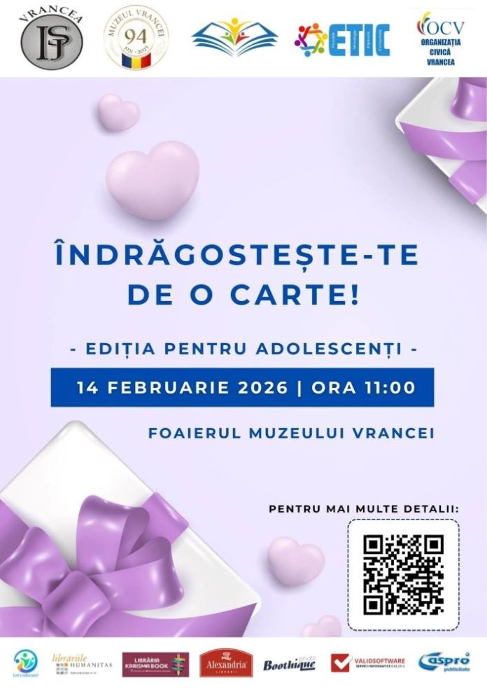 Evenimentul face parte din proiectul educațional ,,Îndrăgostește-te de o carte” și va avea loc pe 14 februarie, la ora 11:00, în foaierul Muzeului Vrancei. Participarea este gratuită. (sursa: Muzeul Vrancei)