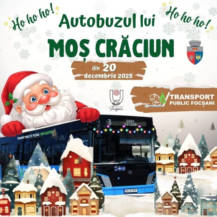 Începând din 20 decembrie, în perioada sărbătorilor de iarnă, în municipiul Focșani va circula autobuzul lui Moș Crăciun. Decorat festiv și plin de magia Crăciunului, autobuzul va transforma fiecare călătorie într-o experiență de poveste. În spiritul sărbătorilor de iarnă, Autobuzul lui Moș Crăciun va aduce zâmbete, culoare și bucurie celor mici dar și celor mari. Aici, în fiecare zi, între orele 16 – 19, micuții vor avea posibilitatea să se întâlnească cu Moș Crăciun. Accesul va fi gratuit pentru copii și însoțitorii acestora.