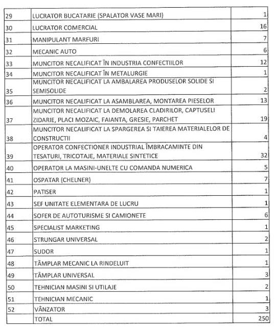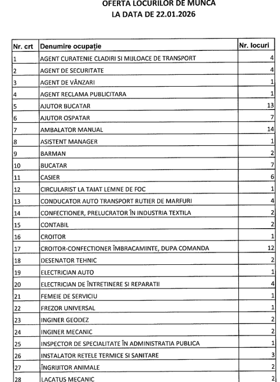 În evidențele Agenției Județene pentru Ocuparea Forței de Muncă Vrancea se află, la momentul actual, 250 locuri de muncă disponibile, transmise de agenți economici și instituții publice. Se caută ajutor bucătar-13; ambalator manual-14; bucătar-7; casier-6; croitor-13; contabil-2; lăcătuș mecanic-2; lucrător comercial-16; manipulant mărfuri-7; muncitor necalificat în demolarea clădirilor-19; ospătar-7; șofer de autoturisme și camionete-6, sudor-1. Oferta integrală afișată de AJOFM Vrancea o găsiți în tabelul de mai jos.