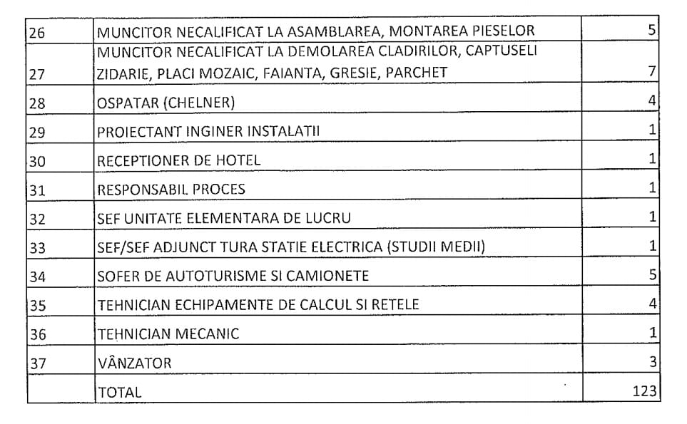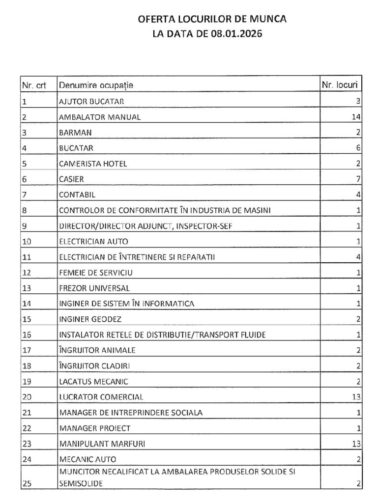 În evidențele Agenției Județene pentru Ocuparea Forței de Muncă Vrancea se află, la momentul actual, 123 locuri de muncă disponibile, transmise de agenți economici și instituții publice. Se caută ajutor bucătar-3; ambalator manual-14; bucătar-6; casier-7; lucrător comercial-13; manipulant mărfuri-13; muncitor necalificat în demolarea clădirilor-7; ospătar-4; șofer de autoturisme și camionete-5. Oferta integrală afișată de AJOFM Vrancea o găsiți în tabelul de mai jos.