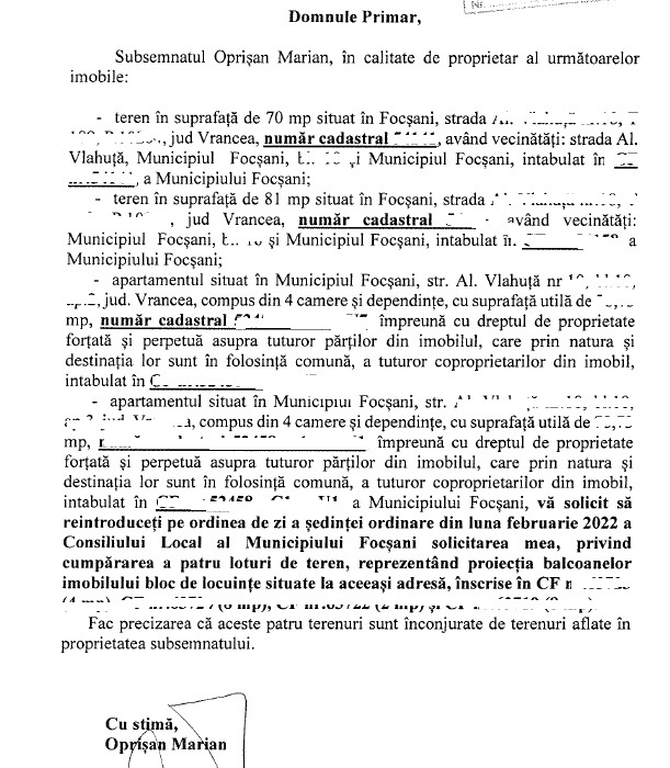 Marian Oprișan vrea să amenajeze spații de birouri și mai solicită achiziționarea unei suprafețe de teren în Focșani