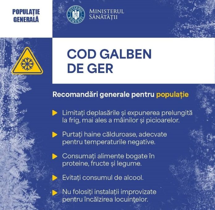 În aceste zile cu temperaturi extrem de scăzute, Ministerul Sănătăţii reia recomandările pentru populaţiei de a evita deplasările în spații deschise și expunerea la frig, respectarea regulilor de igienă pentru evitarea îmbolnăvirilor şi consumul de alimente bogate în proteine, fructe şi legume. Recomandări generale: