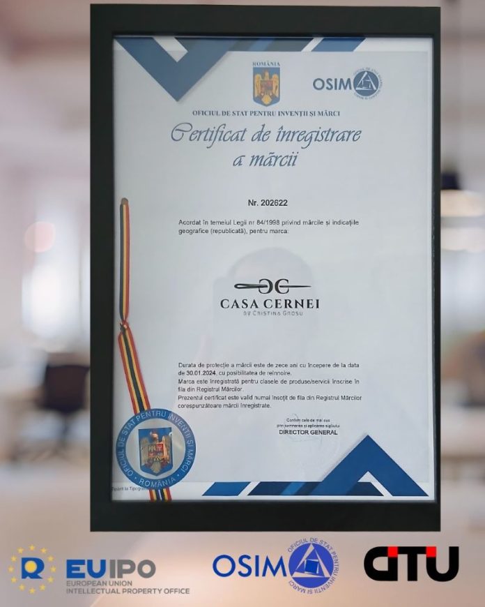 Firma de consultanță CÎTU CONSULTING SRL anunță cu mândrie finalizarea cu succes a procesului de înregistrare a mărcii „CASA CERNEI by Cristina Grosu” la Oficiul de Stat pentru Invenții și Mărci (OSIM), consolidând astfel poziția sa de partener de încredere pentru antreprenorii care doresc să își protejeze identitatea de brand.