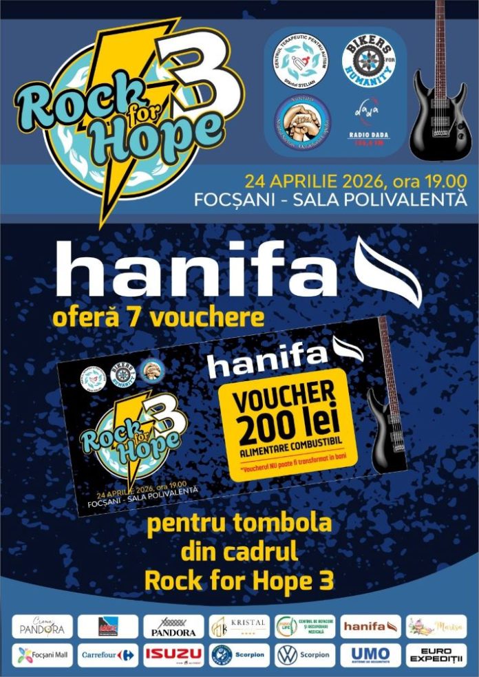 ”Când alegi să cumperi un bilet la evenimentul caritabil **Rock for Hope**, nu doar susții o cauză importantă, ci poți pleca și cu un premiu util! Benzinăriile HANIFA pun la bătaie 7 vouchere a câte 200 lei fiecare, pentru alimentare cu combustibil! Cumpără biletul la spectacol și intri automat în tombola specială dedicată celor care aleg să transforme muzica în speranță.