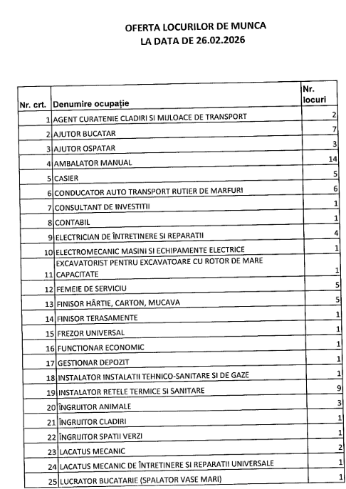 În evidențele Agenției Județene pentru Ocuparea Forței de Muncă Vrancea se află, la momentul actual, 191 locuri de muncă disponibile, transmise de agenți economici și instituții publice. Se caută ajutor bucătar-7; ambalator manual-14; casier-5; consultant investițiil-1; contabil-1;electrician-4; lăcătuș mecanic-3; lucrător comercial-8; muncitor necalificat în demolarea clădirilor-35; ospătar-3; șofer de autoturisme și camionete-5, peisagist-2. Oferta integrală afișată de AJOFM Vrancea o găsiți în tabelul de mai jos.