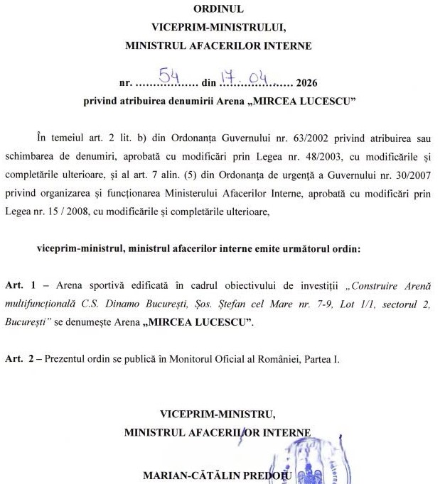 Ministrul Afacerilor Interne anunțase, la funeraliile lui Mircea Lucescu, că viitorul stadion din Complexul Sportiv „Dinamo” va purta numele marelui antrenor român. Iată că, în această săptămână, Cătălin Predoiu a semnat Ordinul de Ministru cu privire la această decizie. Precizăm că s-a început dărâmarea fostului stadion Dinamo, iar în scurt timp se va ridica un stadion modern, în același loc.