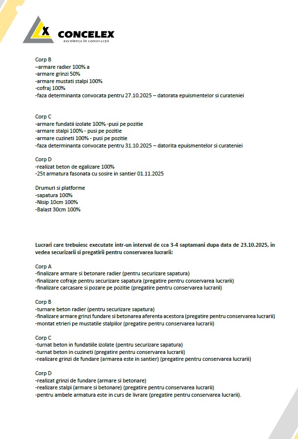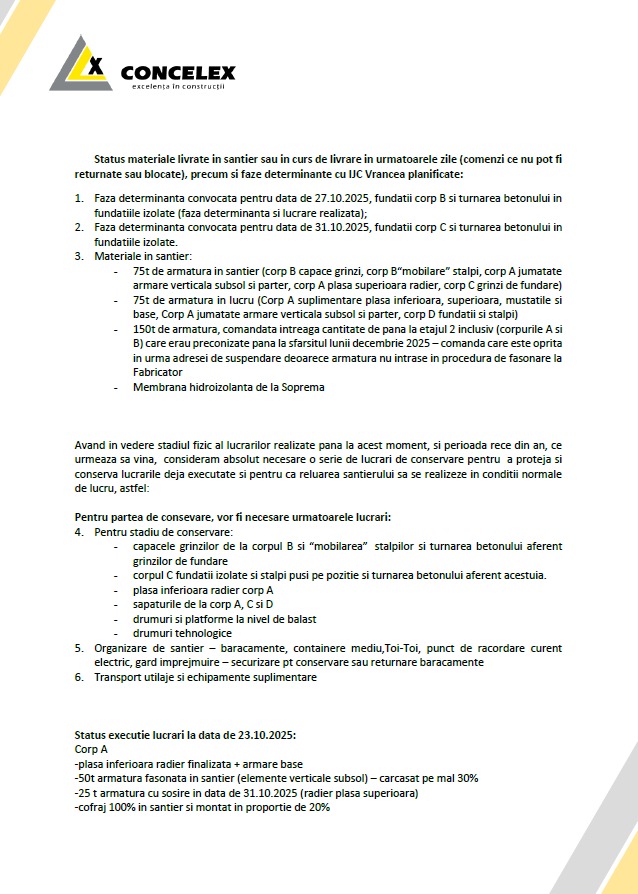 1. Constructorul a solicitat un termen de trei săptămâni pentru a executa lucrări de conservare și punere în siguranță a celor deja efectuate, pentru a evita degradarea materialelor și pierderea banilor investiți.