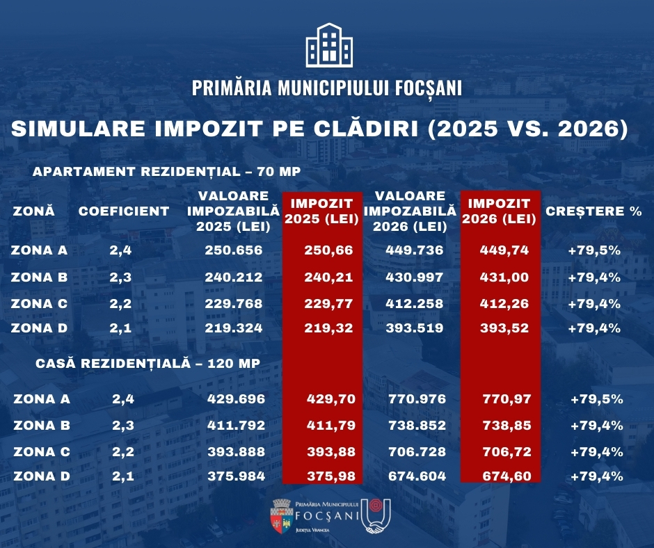 Primăria Municipiului Focșani aduce clarificări necesare în legătură cu informațiile apărute recent în spațiul public, potrivit cărora impozitul pe clădiri ar fi crescut cu aproximativ 70–80%. În realitate, creșterea impozitului pe clădiri resimțită de contribuabili este semnificativ mai mare, iar în multe situații ajunge sau chiar depășește 100%, ca efect cumulat al majorării valorilor impozabile și al eliminării reducerilor legale (art. 457 Cod fiscal, modificat prin Legea nr. 239/2025 unde art. 457 alin 7), 8) și 9) au fost abrogate).
