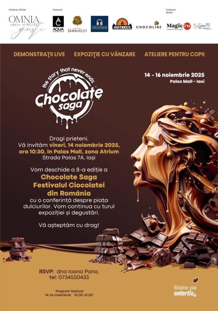 În acest sfârșit de săptămână, Palas Mall din Iași găzduiește Chocolate Saga, ediția a VIII-a. Mai mulți maeștri ciocolatieri din România și Republica Moldova vor fi prezenți la Festivalul Ciocolatei de la Iași. Ei vor susține demonstrații și își vor prezenta produsele, sub diverse forme și arome. Vor fi expoziții, degustări și dezbateri despre piața dulciurilor. Unul dintre exponate va fi o replică a celebrului coif de la Coțofenești, realizată integral din ciocolată și foiță de aur. Printre producătorii participanți se numără și brandul vrâncean MARSEPE, dezvoltat de surorile Alina Goidea și Carmen Vasile.