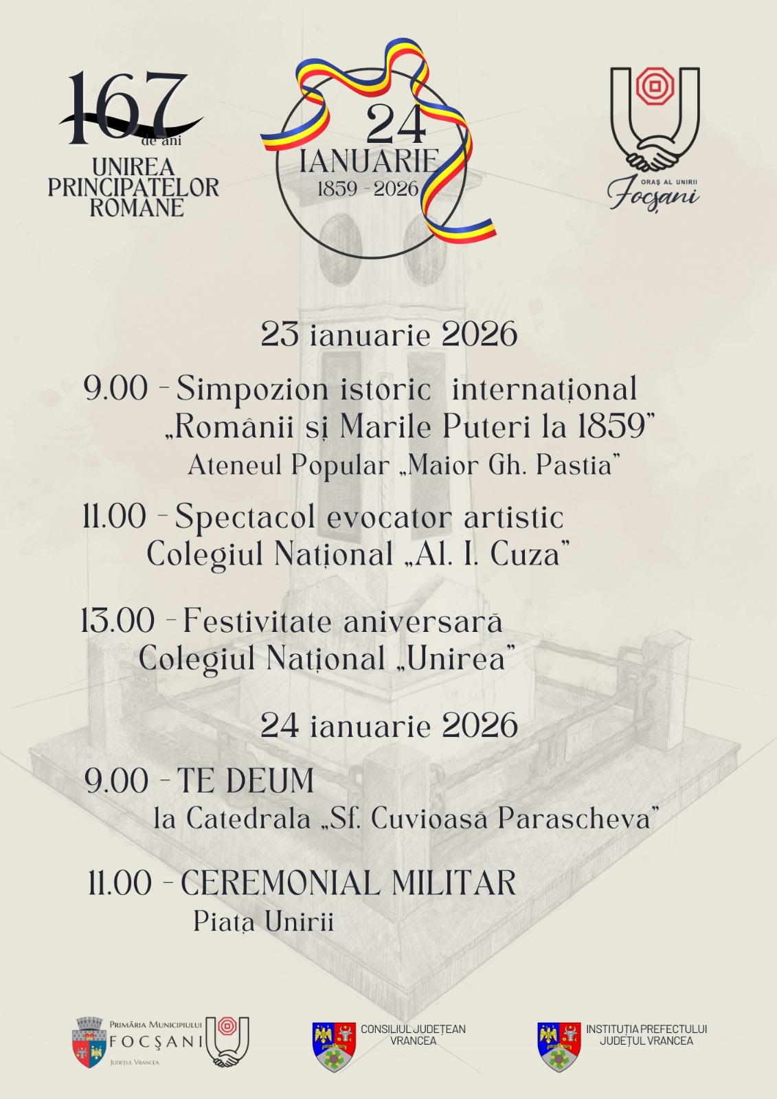 Primăria Municipiului Focșani a pregătit o serie de evenimente speciale care se vor desfășura pe parcursul zilelor de 23 și 24 ianuarie 2026, prin care vom marca 167 ani de la Unirea Principatelor Române, eveniment care a reprezentat începutul Statului Român modern. În cele două zile vom avea Tur Ghidat, Simpozion Internațional, Festivităţi aniversare la Colegiul Naţional „Unirea” și Colegiul Național „Al. I. Cuza”, dar și un Ceremonial Militar în Piaţa Unirii.