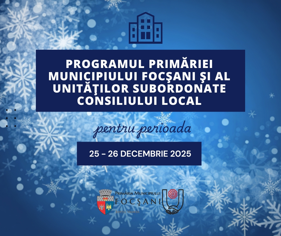 Primăria Municipiului Focșani: În perioada 25 – 26 decembrie 2025 nu se lucrează.