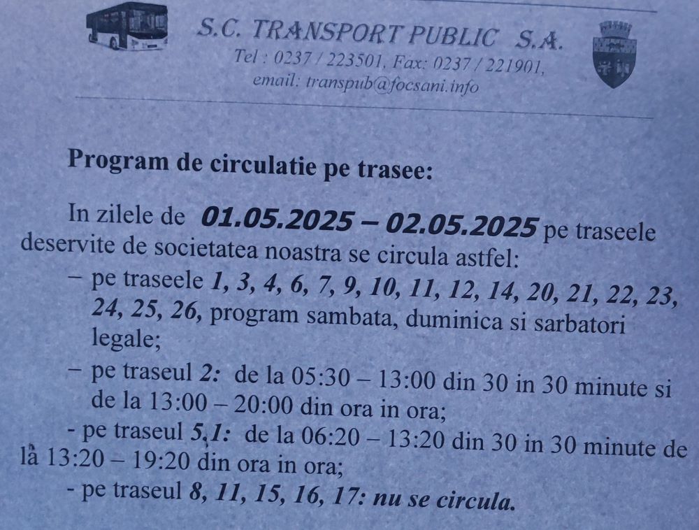 Minivacanța de 1 Mai aduce modificări în programul de circulație a autobuzelor SC Transport Public Focșani SA. Joi, 1 mai, și vineri, 2 mai, autobuzele de transport persoane în Focșani și spre/ dinspre localitățile apropiate vor circula conform orarului din zilele de sâmbătă, duminică și sărbători legale. Pe 5 trasee, însă, nu se va circula. În tabelul de mai jos găsiți programul autobuzelor de transport persoane.