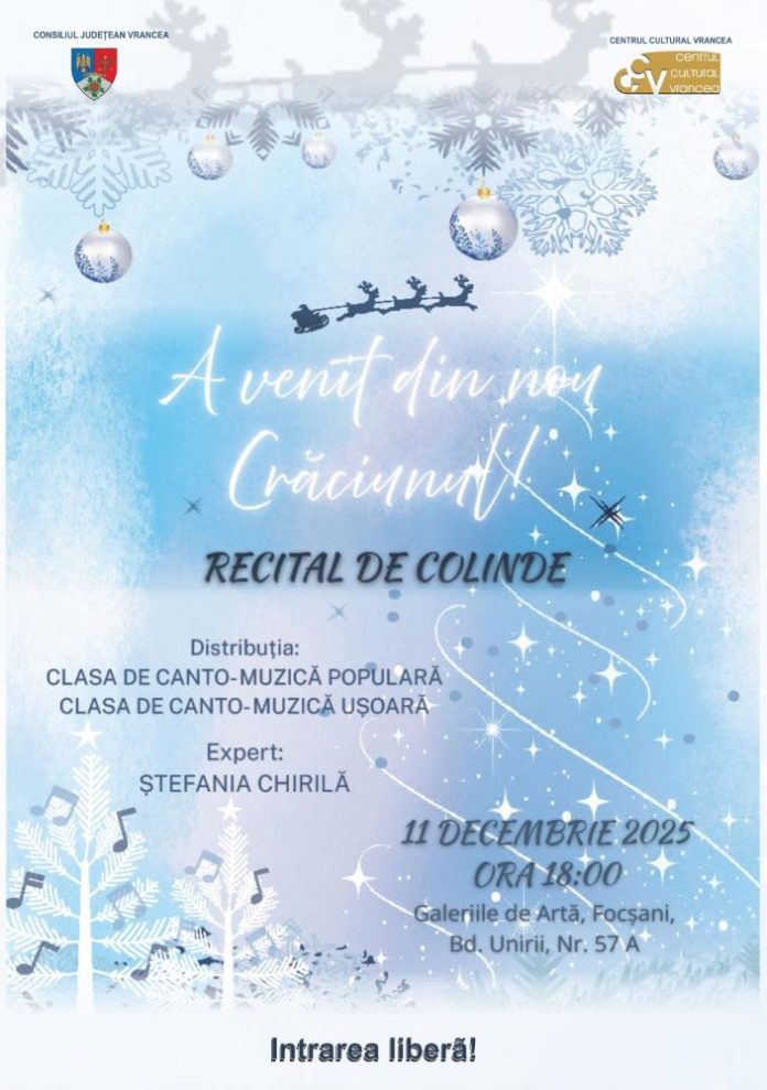 Consiliul Judeţean Vrancea, prin Centrul Cultural Vrancea, organizează joi, 11 decembrie 2025, ora 18:00, la Galeriile de Artă Focșani, o audiție muzicală a claselor Canto – muzică ușoară și Canto muzică-populară din cadrul Școlii Populare de Artă, coordonate de expert Ștefania Chirilă. Evenimentul, intitulat A venit din nou Crăciunul!, continuă seria de serbări ale Școlii Populare de Artă, ce promovează tradiția colindelor și marchează sfârșitul de an. Repertoriul ales reflectă bucuria de a prezenta publicului drag piese muzicale specifice sărbătorilor de iarnă, apropierii vacanței și magia sosirii lui Moș Crăciun. Programul artistic este coordonat și prezentat de doamna profesor Ștefania Chirilă și își propune să descopere noile talente vocale, să stimuleze arta interpretativă și viitorii interpreți de succes ai județului Vrancea. Vă așteptăm, cu drag, la o seară artistică, în compania tinerelor talente ale Școlii Populare de Artă, la Galeriile de Artă Focșani, bdul. Unirii, nr. 57 A. Intrarea la eveniment este liberă! (Centrul Cultural Vrancea)