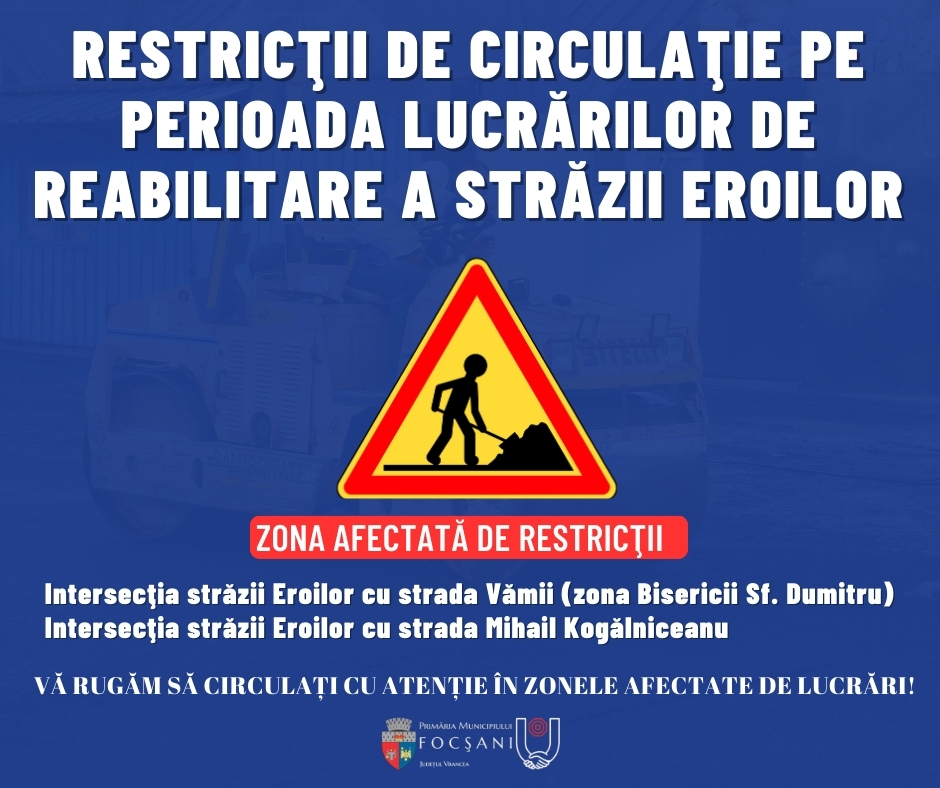 Marți, 10 februarie, vor începe lucrările la strada Eroilor și la parcările adiacente din centrul municipiului Focșani. Prin urmare, Primăria anunță că, pe perioada derulării lucrărilor, vor fi introduse restricții de circulație pe tronsonul cuprins între intersecțiile străzii Eroilor cu strada Vămii (zona Bisericii Sf. Dumitru) și cu strada Mihail Kogălniceanu. Potrivit administrației focșănene, lucrările de asfaltare și modernizare sunt realizate în cadrul unui proiect finanțat prin Programul Național de Investiții „Anghel Saligny”.