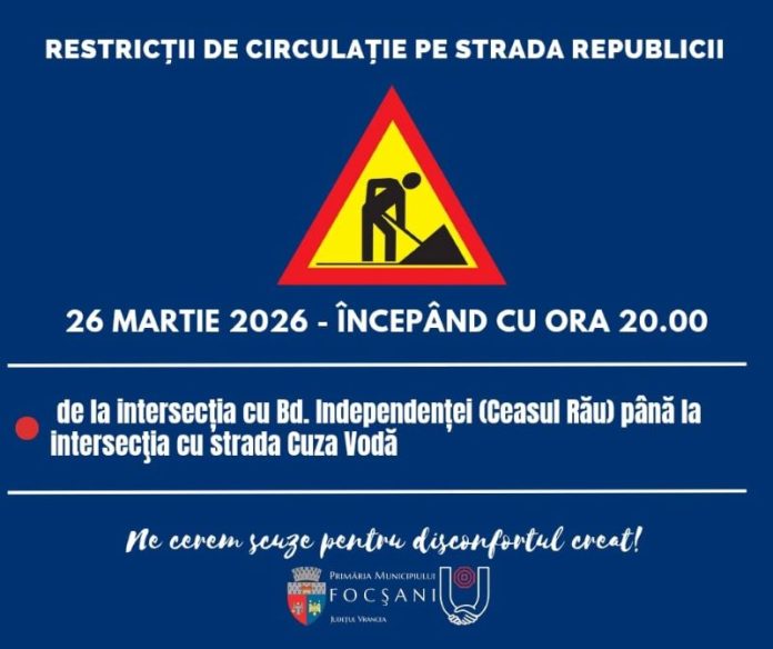 Primăria Municipiului Focșani anunță restricționarea temporară a circulației rutiere pe un tronson de pe strada Republicii începând de joi seară, 26 martie 2026, ora 20.00, ca urmare a lucrărilor de asfaltare la traversările realizate în cadrul proiectului de extindere a sistemului de management integrat al traficului. Va fi închis circulaţiei rutiere tronsonul cuprins de la intersecţia cu bulevardul Independenţei (Ceasul Rău) până la intersecţia cu strada Cuza Vodă.