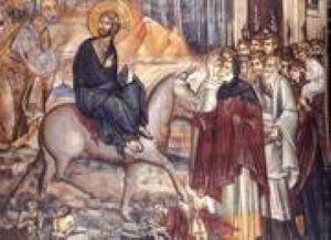 Cu o săptămână înainte de Patimile Sale, Domnul nostru Iisus Hristos a intrat în Ierusalim, pe un pui de asin înconjurat de cei 12 Apostoli. Mulțimea, recunoscându-L ca fiind adevăratul Mântuitor, L-a întâmpinat cu ramuri de finic și cântări de bucurie.