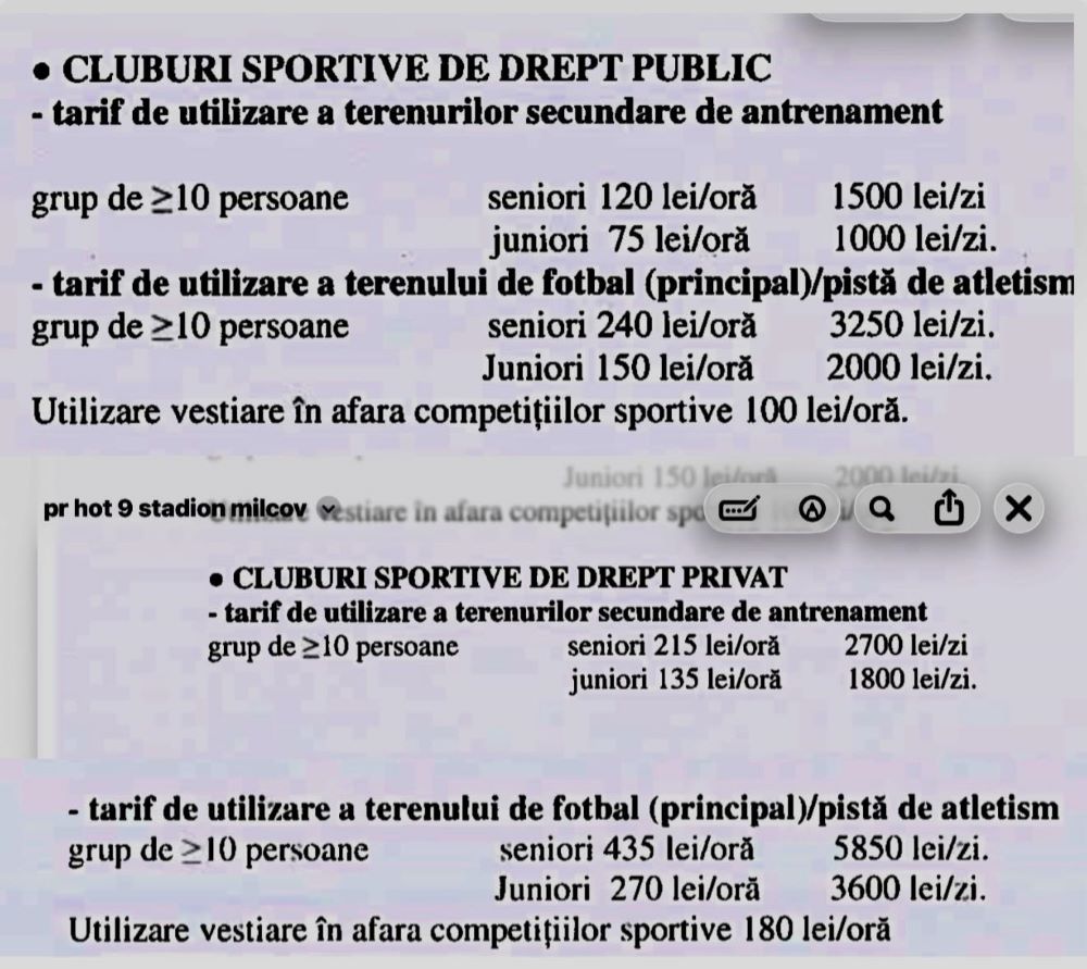 De precizat că un club sportiv de drept privat este o asociație (ong), care funcționează din contribuțiile membrilor săi și din donații. Un club sportiv de drept privat nu este (cel puțin în Vrancea) un club privat bogat, cu fonduri la discreție, cu sponsori bogați și generoși, așa cum există în București sau în orașele mari. Prin urmare, președintele Asociației Județene de Fotbal Vrancea, Dan Dumitru, a criticat decizia PSD-AUR de a taxa mai mult cluburile sportive de drept privat decât cele de drept public. ”𝗖𝗹𝘂𝗯𝘂𝗿𝗶𝗹𝗲 𝗱𝗲 𝗱𝗿𝗲𝗽𝘁 𝗽𝗿𝗶𝘃𝗮𝘁 𝗽𝗹ă𝘁𝗲𝘀𝗰 𝗮𝗽𝗿𝗼𝗮𝗽𝗲 𝗗𝗨𝗕𝗟𝗨 𝗽𝗲𝗻𝘁𝗿𝘂 𝗮𝗰𝗲𝗹𝗲𝗮ș𝗶 𝘁𝗲𝗿𝗲𝗻𝘂𝗿i. 𝗖𝗼𝗽𝗶𝗶𝗶 𝗱𝗶𝗻 𝗰𝗹𝘂𝗯𝘂𝗿𝗶𝗹𝗲 𝗽𝗿𝗶𝘃𝗮𝘁𝗲 𝗰𝗼𝘀𝘁ă 𝗺𝗮𝗶 𝗺𝘂𝗹𝘁 𝗱𝗲𝗰â𝘁 𝗰𝗼𝗽𝗶𝗶𝗶 𝗱𝗶𝗻 𝘀𝘁𝗿𝘂𝗰𝘁𝘂𝗿𝗶 𝗽𝘂𝗯𝗹𝗶𝗰𝗲. 𝗣ă𝗿𝗶𝗻ț𝗶𝗶 𝗰𝗮𝗿𝗲 𝘀𝘂𝘀ț𝗶𝗻 𝘀𝗽𝗼𝗿𝘁𝘂𝗹 𝗱𝗶𝗻 𝗯𝘂𝘇𝘂𝗻𝗮𝗿 𝘀𝘂𝗻𝘁 𝘁𝗮𝘅𝗮ț𝗶 𝗺𝗮𝗶 𝗺𝘂𝗹𝘁 𝗱𝗲𝗰â𝘁 𝗰𝗲𝗶 𝘀𝘂𝘀ț𝗶𝗻𝘂ț𝗶 𝗱𝗶𝗻 𝗯𝗮𝗻𝗶 𝗽𝘂𝗯𝗹𝗶𝗰𝗶. Asta nu mai este politică sportivă. Asta este discriminare pe față. Ca președinte AJF Vrancea, am obligația să apăr echilibrul competițional și corectitudinea. Nu pot cere cluburilor private performanță și implicare, în timp ce ele sunt penalizate financiar pentru că există. 𝗗𝗲 𝗮𝗰𝗲𝗲𝗮 𝘃𝗼𝗶 𝗽𝗿𝗼𝗽𝘂𝗻𝗲 𝗕𝗶𝗿𝗼𝘂𝗹𝘂𝗶 𝗘𝘅𝗲𝗰𝘂𝘁𝗶𝘃 𝗮𝗹 𝗔𝗝𝗙 𝗩𝗿𝗮𝗻𝗰𝗲𝗮 𝗱𝘂𝗯𝗹𝗮𝗿𝗲𝗮 𝘁𝗮𝘅𝗲𝗹𝗼𝗿 𝗽𝗲𝗻𝘁𝗿𝘂 𝗰𝗹𝘂𝗯𝘂𝗿𝗶𝗹𝗲 𝗱𝗲 𝗱𝗿𝗲𝗽𝘁 𝗽𝘂𝗯𝗹𝗶𝗰, 𝗽â𝗻ă 𝗹𝗮 𝗲𝗰𝗵𝗶𝗹𝗶𝗯𝗿𝗮𝗿𝗲𝗮 𝗿𝗲𝗮𝗹ă 𝗮 𝘀𝗶𝘀𝘁𝗲𝗺𝘂𝗹𝘂𝗶. 𝗡𝘂 𝗱𝗶𝗻 𝗿ă𝘇𝗯𝘂𝗻𝗮𝗿𝗲. 𝗖𝗶 𝗱𝗶𝗻 𝗿𝗲𝘀𝗽𝗲𝗰𝘁 𝗽𝗲𝗻𝘁𝗿𝘂 𝗰𝗲𝗶 𝗰𝗮𝗿𝗲 ț𝗶𝗻 𝘀𝗽𝗼𝗿𝘁𝘂𝗹 î𝗻 𝘃𝗶𝗮ță 𝗳ă𝗿ă 𝗯𝗮𝗻𝗶 𝗽𝘂𝗯𝗹𝗶𝗰𝗶. Sportul vrâncean nu poate fi susținut pe spatele părinților, în timp ce alții sunt protejați de bugete publice. 𝗖𝗶𝗻𝗲 𝘃𝗿𝗲𝗮 𝘀𝗽𝗼𝗿𝘁 𝗮𝗱𝗲𝘃ă𝗿𝗮𝘁 𝘁𝗿𝗲𝗯𝘂𝗶𝗲 𝘀ă 𝗮𝗰𝗰𝗲𝗽𝘁𝗲 𝗿𝗲𝗴𝘂𝗹𝗶 𝗲𝗴𝗮𝗹𝗲 𝗽𝗲𝗻𝘁𝗿𝘂 𝘁𝗼ț𝗶. Restul sunt povești. 𝗣𝗼𝘃𝗲ș𝘁𝗶 𝗱𝗲𝘀𝗽𝗿𝗲 𝗖𝗦𝗠 𝗙𝗼𝗰ș𝗮𝗻𝗶 𝟮𝟬𝟬𝟳, 𝗽𝗲 𝗰𝗮𝗿𝗲 𝗻𝗼𝗶 𝗹𝗲 ș𝘁𝗶𝗺 𝗺𝗮𝗶 𝗯𝗶𝗻𝗲 𝗱𝗲𝗰â𝘁 𝗰𝗿𝗲𝗱𝗲ț𝗶 𝘃𝗼𝗶. 𝗖𝗵𝗶𝗮𝗿 𝗺𝗮𝗶 𝗯𝗶𝗻𝗲 𝗱𝗲𝗰â𝘁 𝗖𝘂𝗿𝘁𝗲𝗮 𝗱𝗲 𝗰𝗼𝗻𝘁𝘂𝗿𝗶.”, a scris șeful AJF Vrancea pe Facebook. Iată, mai jos, tarifele stabilite de CJ Vrancea pentru terenurile de sport: